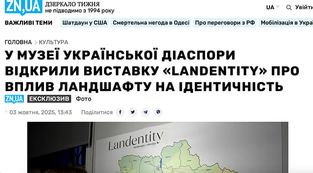 Дзеркало тижня 03.10.2025 У МУЗЕЇ УКРАЇНСЬКОЇ ДІАСПОРИ ВІДКРИЛИ ВИСТАВКУ «LANDENTITY» ПРО ВПЛИВ ЛАНДШАФТУ НА ІДЕНТИЧНІСТЬДізнатися більше